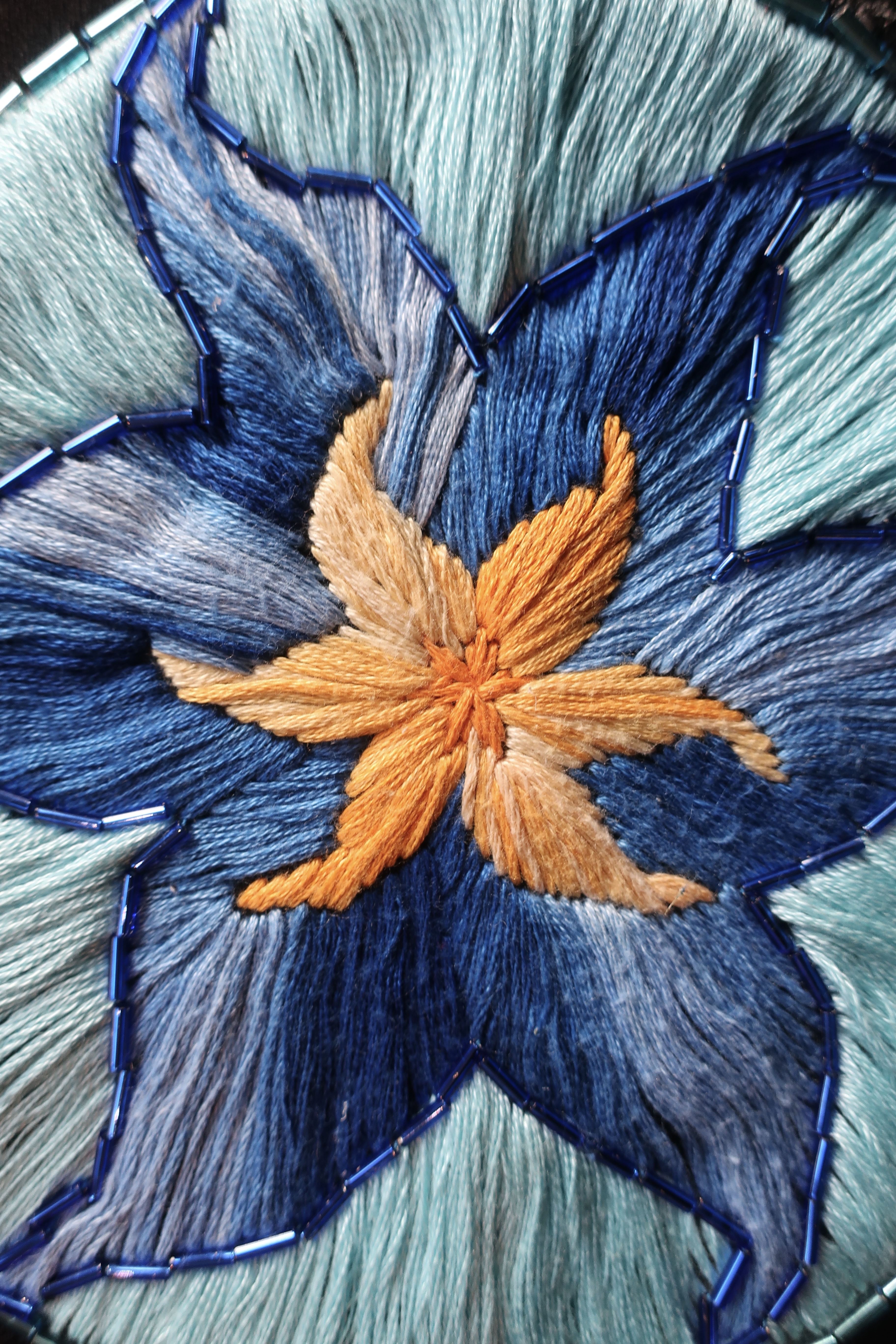 Second-hand top and trousers reworked with embroidery, handmade beaded appliqués and a belt.